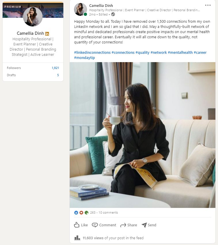 LinkedIn is a perfect tool for the matter of personal branding in a professional business context. Let’s take my LinkedIn profile as an example. I understand it’s not the TOP TOP profile of thousands or millions of followers, but I am confident that it is a type of profile that not everyone can have. My profile is professional and interesting enough to impress an increasing number of audience. I’ve started to talk about LinkedIn more and more often to both old and young generations and I can’t stress enough what LinkedIn can actually do for you if you use it wisely – for your life learning and career. The reason that I said you need to use it wisely is because LinkedIn itself can be full of trash and it can negatively impact on your mental health if you connect with the wrong type of people. Everyone can be the ‘wrong’ type of people if you cannot find the good in them, if they don’t add value to your life and especially if that person brings you more harms than goods to your own well-being. In this case, I would immediately disconnect with these connections without giving myself a second thought. I know I might sound a little harsh but life has enough trouble of its own.